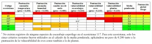 – Finally, the lowest weight was assigned to criteria 1 and 2 (projected changes in average temperature and humidity; 0.1 each), because these have a more long-term effect on ecosystems, and to avoid redundancy since these criteria were already taken into account in the assessment of species vulnerability using NatureServe’s CCVI.